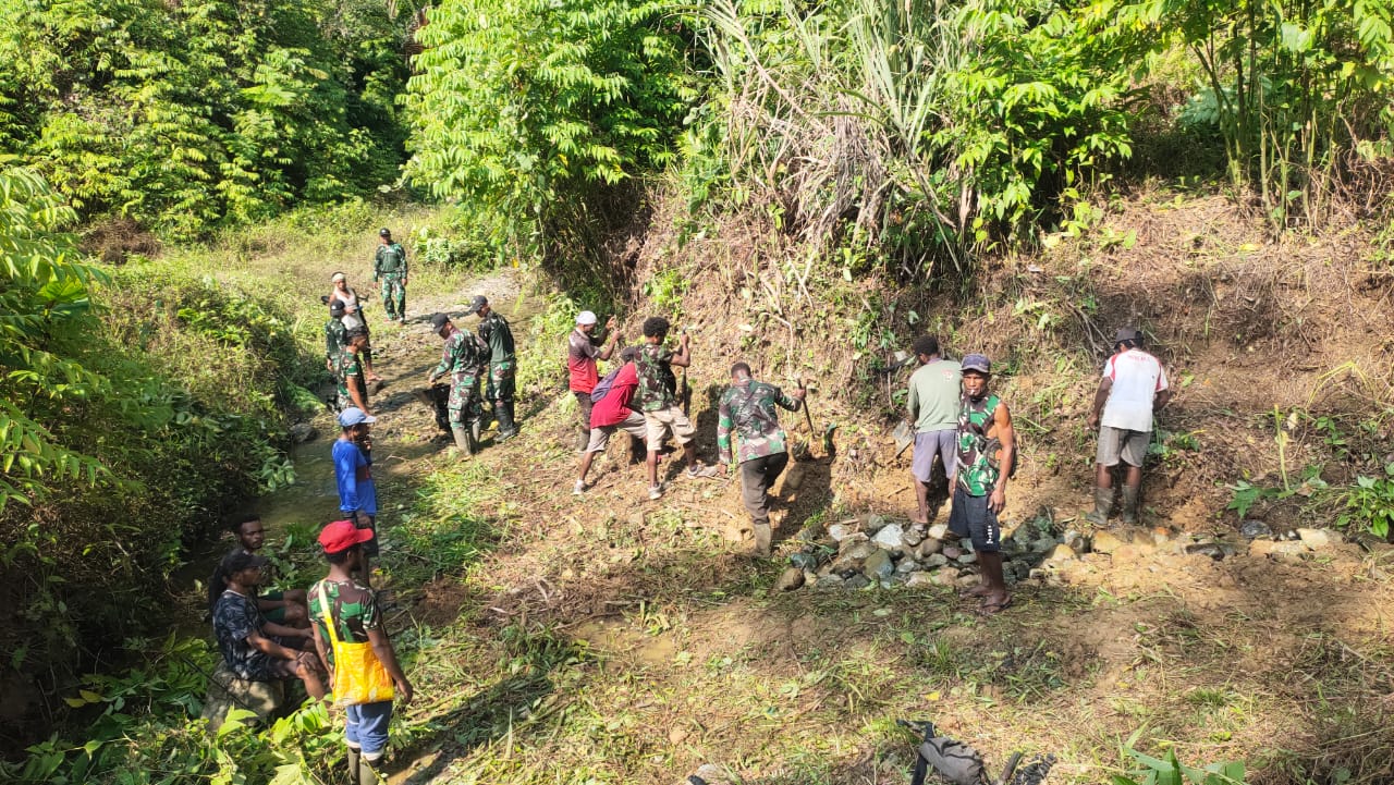 Kolaborasi antara Satgas Yonif 512/QY dan masyarakat setempat menunjukkan kekompakan dan semangat gotong royong dalam menghadapi tantangan infrastruktur di wilayah perbatasan.