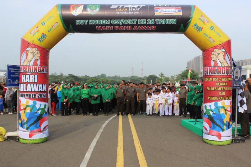 BEKASI CARIBERITA – Suasana semarak dan penuh kebersamaan terlihat di Lapangan Central Park Meikarta, Cikarang, Kabupaten Bekasi, ketika ribuan warga memadati area untuk mengikuti jalan sehat dalam rangka memperingati Hari Pahlawan sekaligus HUT ke-26 Korem 051/Wijayakarta. Minggu (10/11/2024)