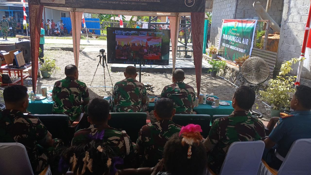 TIMIKA CARIBERITA – Komandan Kodim 1710/Mimika Letkol Inf M. Slamet Wijaya, S.Sos., M. Han., M.A. mendampingi Danrem 173/PVB Brigjen TNI Frits Wilem Rizard Pelamonia mengikuti Video Conference (Vicon) peresmian penggunaan fasilitas air bersih bersama Kepala Staf TNI Angkatan Darat Jenderal TNI Maruli Simanjuntak, bertempat di Rt 3, Jl. M. Mairimau, Kampung Nawaripi, Distrik Wania, Kab. Mimika, Rabu (13/11/2024).