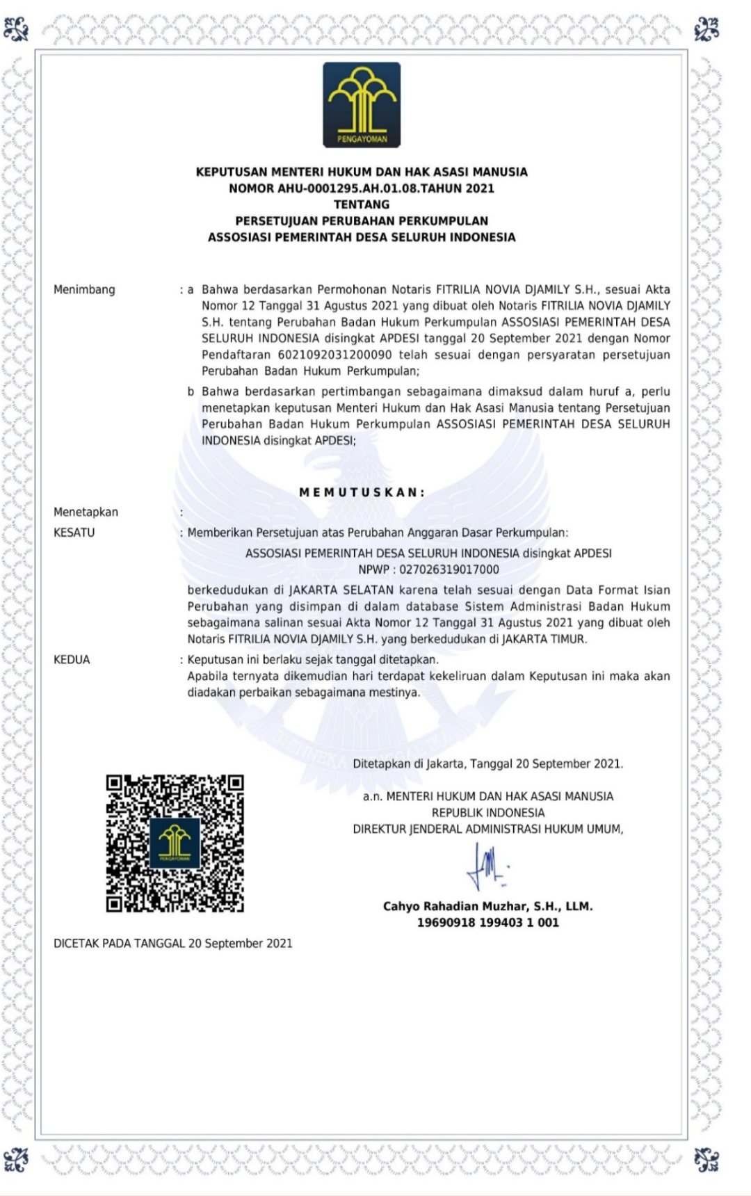 Bahwa Sesuai dengan ketentuan hukum yang berlaku pada Undang-undang Nomor 17 Tahun 2013 tentang Organisasi Kemasyarakatan bahwa Assosiasi Pemerintah Desa Seluruh Indonesia atau disingkat APDESI telah mendapatkan pengesahan dari Kementerian Hukum dan HAM dengan Nomor AHU-0001295-AH.01.08 Tahun 2021 dengan Ketua Umum, Arifin Abdul Majid. S, S.Sos., MM (Jawa Barat), Sekretaris Jenderal, Muksalmina (Aceh) dan H. Tasman (Sulawesi Tenggara) sebagai Bendahara Umum. (terlampir)