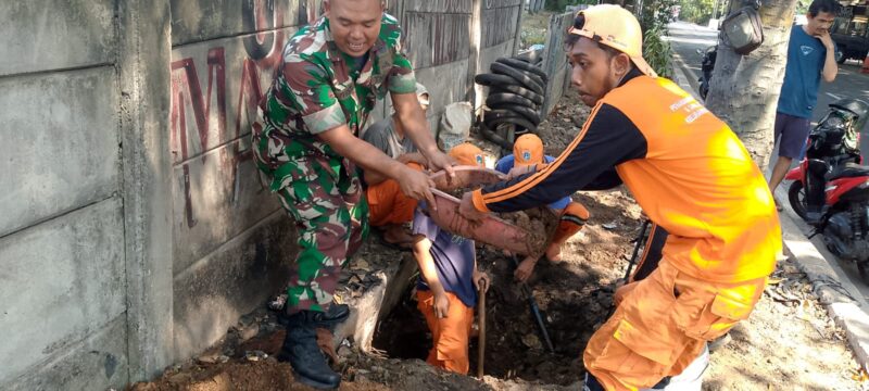 Babinsa Pulogebang Pelda Haris bersama PPSU melakukan kegiatan pembersihan selokan dari sampah dan lumpur yang menghambat jalannya arus air di selokan tersebut.