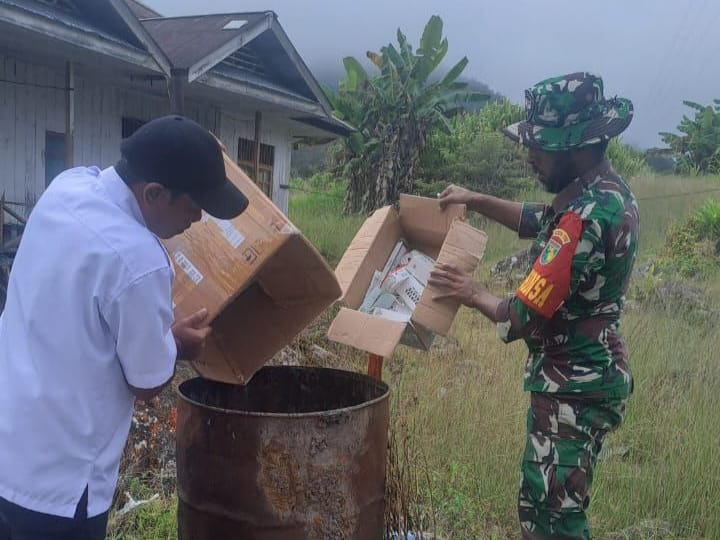 TIMIKA, CARIBERITA – Anggota Babinsa Koramil 1710-05/Jila, Serda Kornelis Afaratu mendampingi Kepala Puskesmas Jila, Kep.,Ns M. Imron dan para tenaga kesehatan dalam rangka pemusnahan obat-obatan kadaluwarsa di Puskesmas Jila, Distrik Jila, Kabupaten Mimika, Kamis (02/01/2025).
