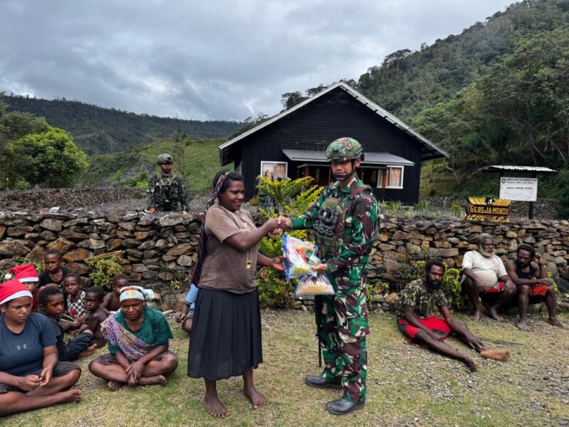 PUNCAK JAYA, CARIBERITA – Pos Tinolok Satgas Pamtas Kewilayahan Yonif 715/Motuliato, membagikan sembako berupa beras kepada masyarakat sekitar Pos Tinolok di wilayah Distrik Mulia, Puncak Jaya, Papua Tengah, Jum’at (03/01/2025).