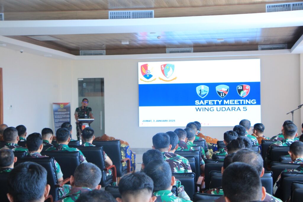 MAKASSAR, CARIBERITA – Mengawali tahun 2025, Komandan Lanud Sultan Hasanuddin (Danlanud), Marsma TNI Bonang Bayuaji G., S.E., M.M., CHRMP., menggelar Safety Meeting membahas Keselamatan Terbang dan Kerja, bertempat di Ruang Rapat Supernova Baseops Lanud Sultan Hasanuddin, Makassar, Jumat (3/1/2025).