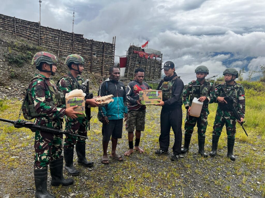 PUNCAK JAYA CARIBERITA – Personel Satgas Pamtas Kewilayahan Yonif 715/Motuliato Pos Pintu Angin dipimpin oleh Danpos Lettu Inf Eka Yudha Siregar, melaksanakan kegiatan pembagian sembako kepada warga kampung Muara dalam rangka membangun tali silaturahmi dan membantu kesulitan masyarakat setempat, Jumat (101/2025).
