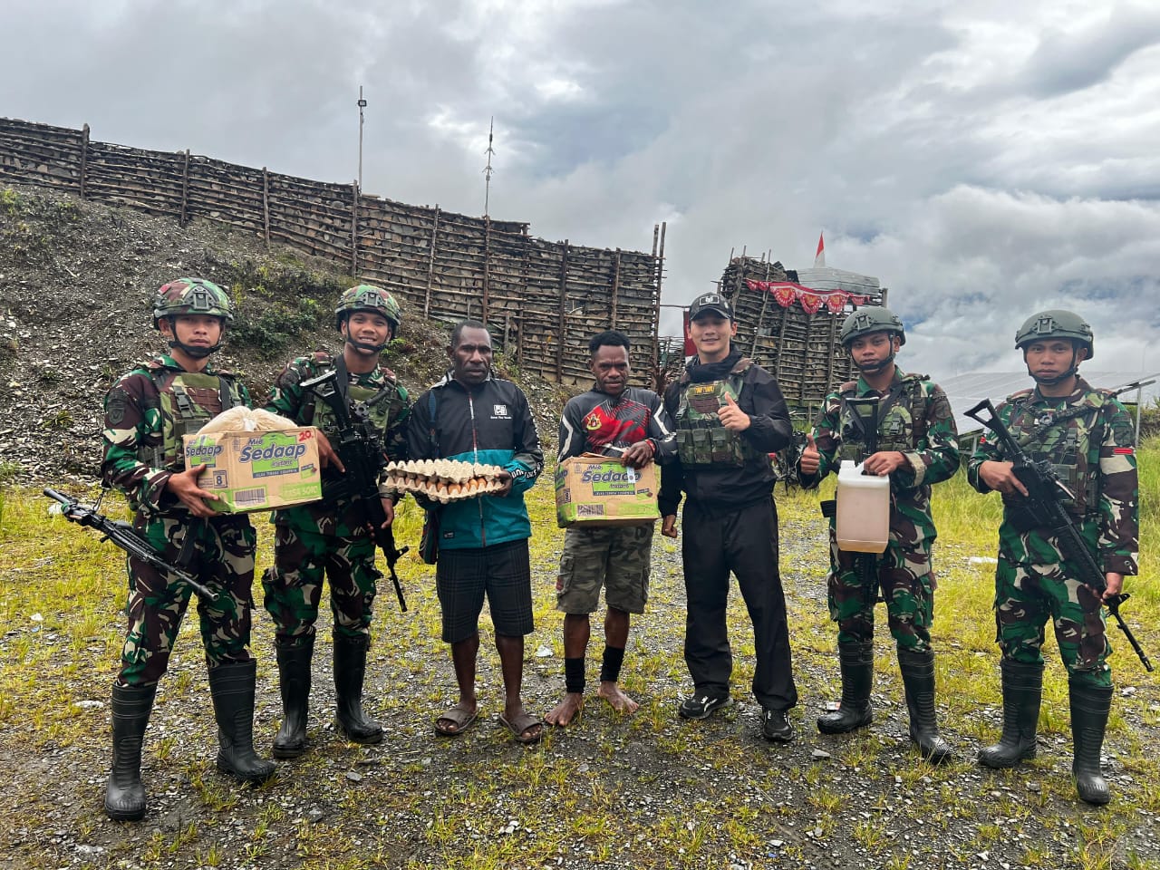 PUNCAK JAYA CARIBERITA – Personel Satgas Pamtas Kewilayahan Yonif 715/Motuliato Pos Pintu Angin dipimpin oleh Danpos Lettu Inf Eka Yudha Siregar, melaksanakan kegiatan pembagian sembako kepada warga kampung Muara dalam rangka membangun tali silaturahmi dan membantu kesulitan masyarakat setempat, Jumat (101/2025).