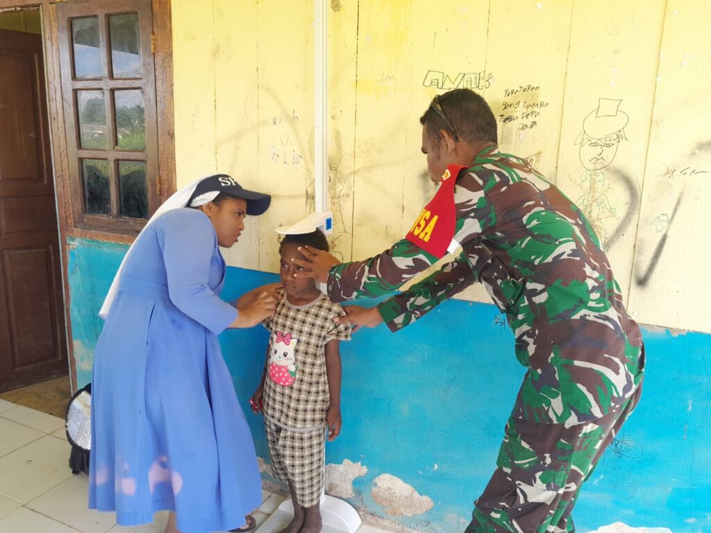 TIMIKA CARIBERITA – Bintara Pembina Desa (Babinsa) Koramil 1710-06/Agimuga Koptu Yohanes Naibobe bersama-sama petugas kesehatan dari Puskesmas Agimuga melaksanakan kegiatan Pos Pelayanan Terpadu (Posyandu) bertempat di Balai Kampung Kiliarma, Distrik Agimuga, Kab. Mimika, Sabtu (11/01/2025).