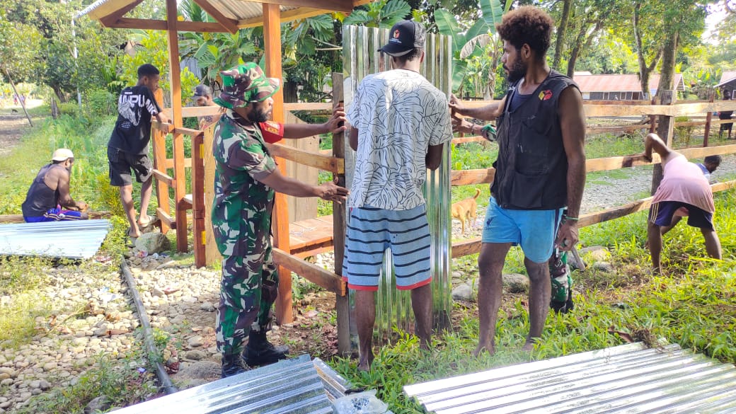 PUNCAK JAYA, CARIBERITA – Dalam rangka mengimplementasikan 8 Wajib TNI yang kelima, Babinsa Pos ramil 1714-07/Fawi, Sertu Agus Bonggoibo bersama masyarakat melaksanakan Karya Bhakti pembuatan pagar gereja Kampung Soi Distrik Fawi, Kabupaten Puncak Jaya Provinsi Papua Tengah, Kamis (23/01/2025).