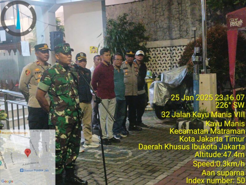 JAKARTA CARIBERITA – Plh. Danramil Matraman Kapten Inf Sukir, bersama Tiga pilar gelar apel gabungan operasi cipta kondusif pelaksanaan Guantibmas bertempat di halaman Kantot Kelurahan Kayu manis, Kecamatan Matraman, Sabtu (26/01/25) malam.