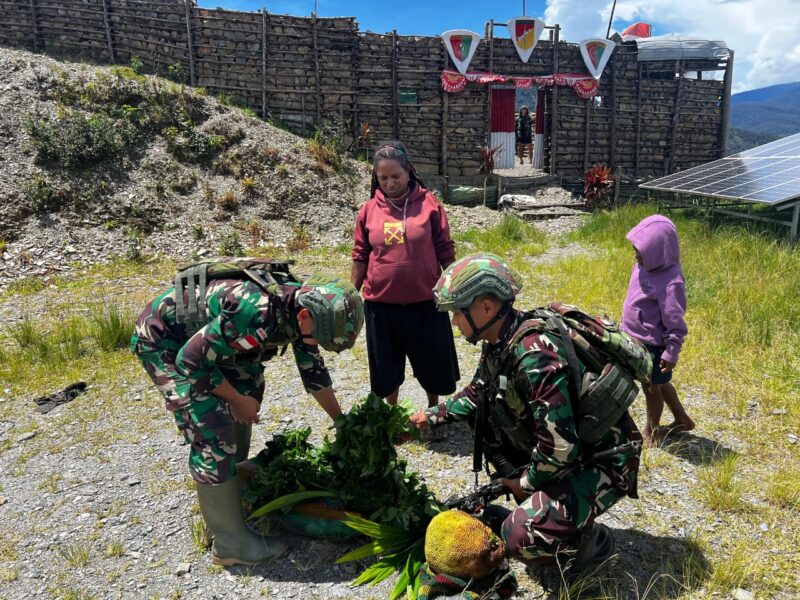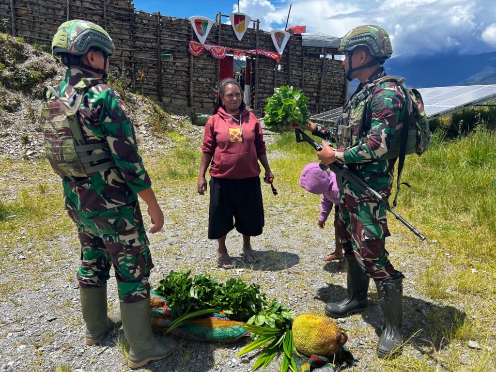 PUNCAK JAYA CARIBERITA – Satgas Yonif 715/Mtl Pos Pintu Angin memborong habis hasil tani dari Mama Papua yang datang ke Pos stelah memanen kebunnya yang berada di Puncak Jaya Papua, Senin (3/02/2025).