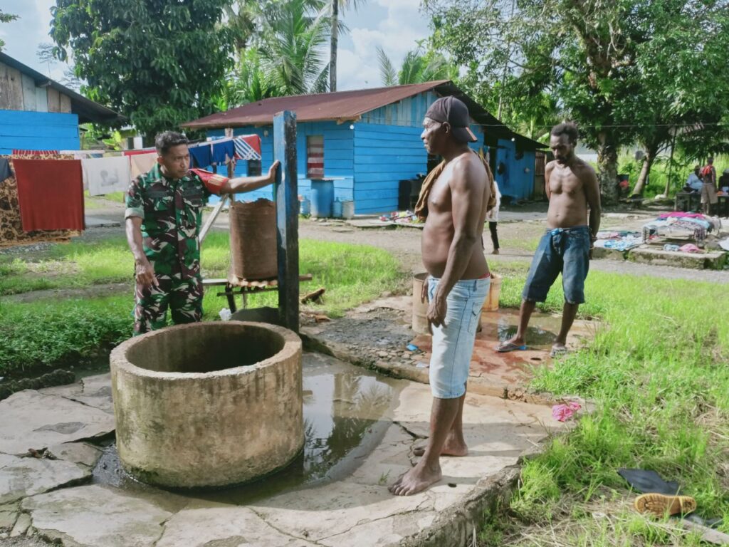 Kegiatan tersebut dilaksanakan di Kampung Mawokau Jaya, Distrik Wania, Kabupaten Mimika dimana pada kesempatan tersebut, Sertu Rusdin Wali memeriksa kondisi sumur yang sudah ada. Babinsa pun memeriksa kondisi sumur dan juga umur sumur sambil bercengkrama dengan warga setempat.