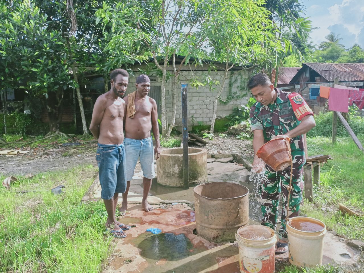 Kegiatan tersebut dilaksanakan di Kampung Mawokau Jaya, Distrik Wania, Kabupaten Mimika dimana pada kesempatan tersebut, Sertu Rusdin Wali memeriksa kondisi sumur yang sudah ada. Babinsa pun memeriksa kondisi sumur dan juga umur sumur sambil bercengkrama dengan warga setempat.