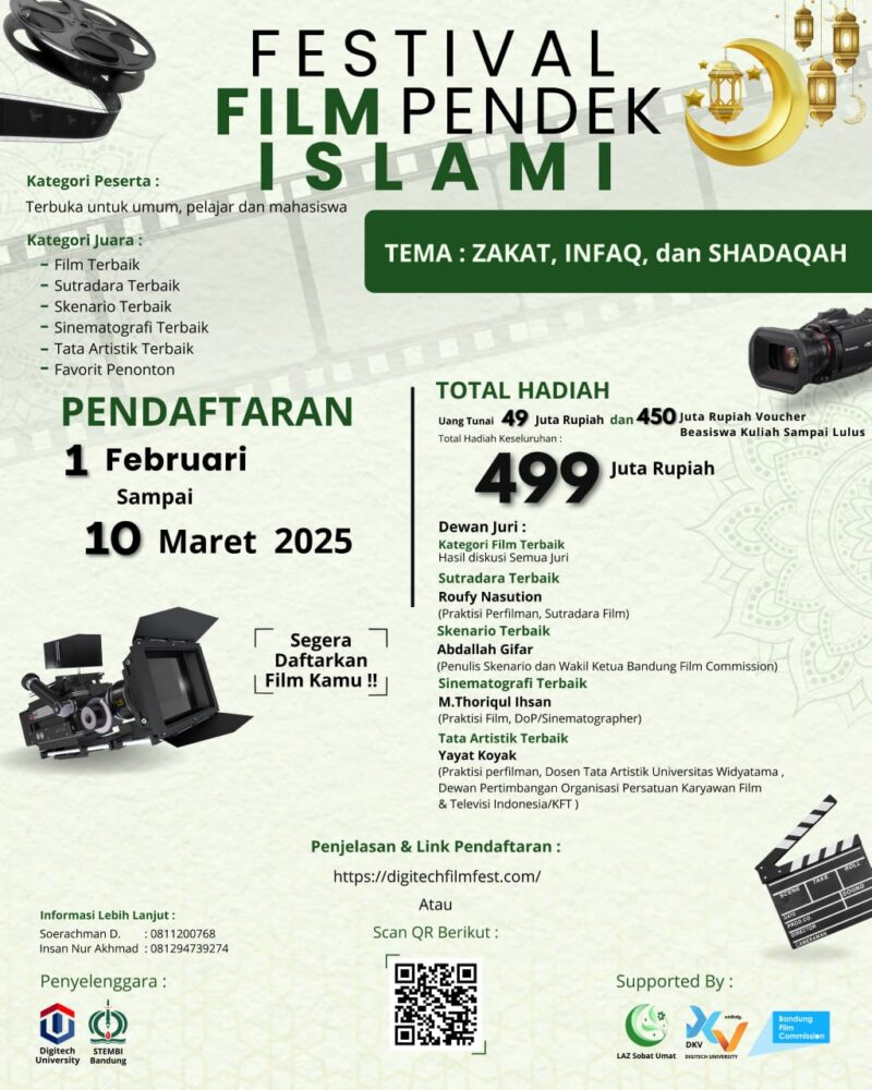 JAKARTA, CARIBERITA –Digitech University dan STEMBI Bandung akan menggelar Digitech Film Festival 2025, sebuah festival film pendek Islami yang terbuka untuk umum, pelajar, dan mahasiswa. Festival ini mengajak para sineas muda untuk berpartisipasi dengan tema yang sangat relevan Zakat, Infaq, dan Shadaqah.