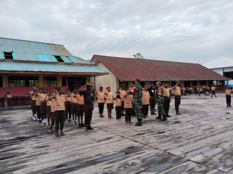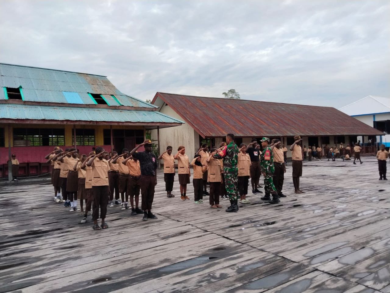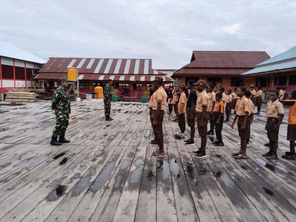 TIMIKA, CARIBERITA – Babinsa Koramil 1710-07/Mapurujaya Sertu Slamet Jaya Abadi dan Sertu Yulius Nampe memberikan pelatihan Peraturan Baris Berbaris (PBB) kepada siswa dan siswi Sekolah Dasar Inpres Poumako guna membentuk jiwa kedisiplinan sejak dini, bertempat di Kampung Poumako, Distrik Mimika Timur, Kab. Mimkka. Sabtu (8/2/2025).