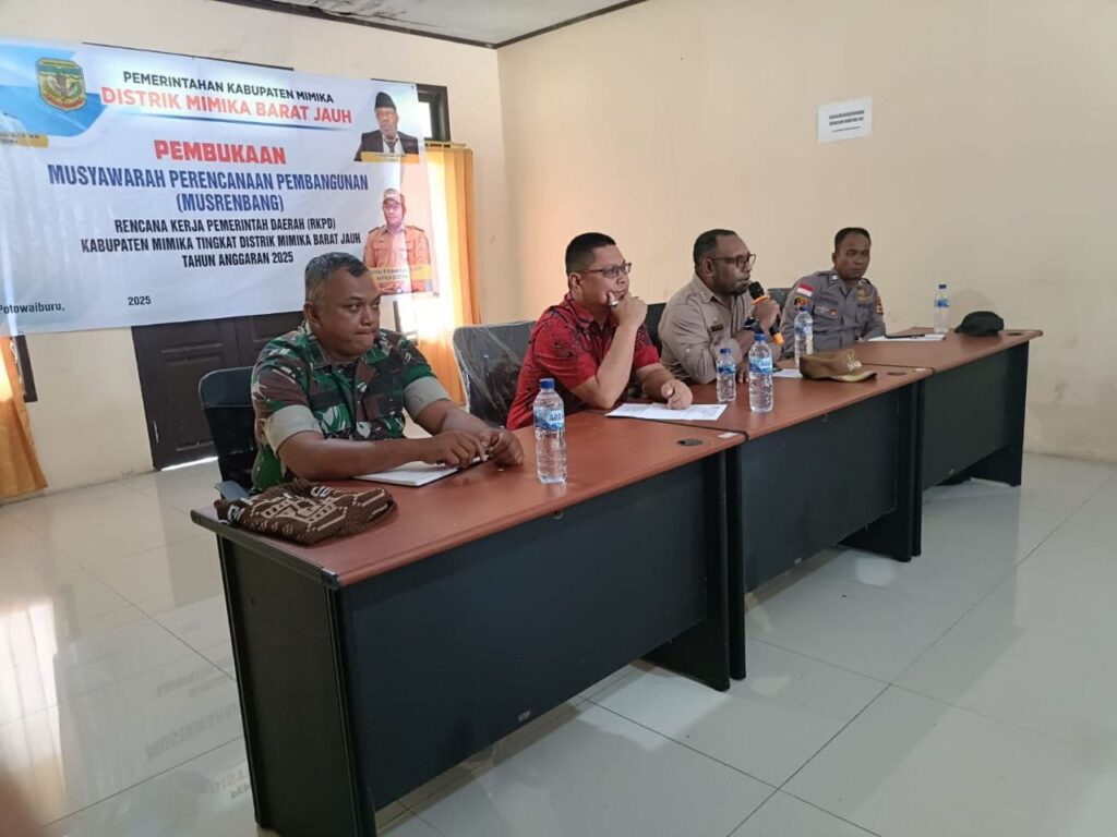 Hal tersebut dilakukan agar rencana pembangunan di wilayah akan senantiasa selaras dengan aspirasi masyarakat. Kegiatan Musrenbang ini dilaksanakan di Kantor Distrik Mimika Barat Jauh, Kabupaten Mimika, dipimpin Tim Asistensi Bapeda Mimika dan juga dihadiri Kadistrik Mimika Barat Jauh serta para kepala kampung se-Distrik Mimika Barat Jauh.