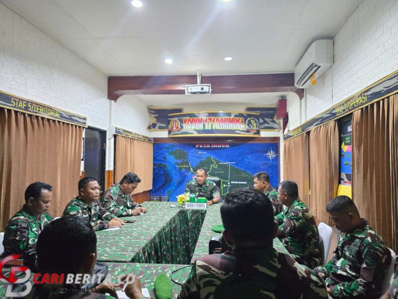 Timika – Untuk menyamakan persepsi dan visi dalam pelaksanaan tugas, Dandim 1710/Mimika, Letkol Inf M. Slamet Wijaya, S.Sos., M.Han., M.A. melaksanakan rapat dengan jajaran Staf dan Koramil, Senin (03/03/2025).