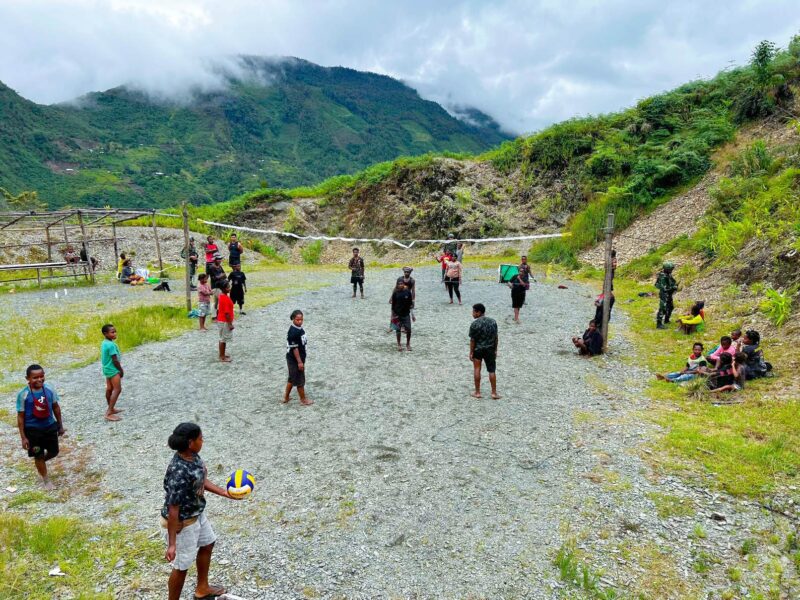 PUNCAK JAYA, CARIBERITA – Satgas Yonif 715/Mtl Pos Pintu Angin olahraga bersama warga binaan di Distrik Muara, tidak hanya menjalin kedekatan saja Satgas Yonif 715/Mtl juga peduli akan kesehatan warga binaan yang ada di sekitar Pos Pintu Angin salah satu caranya adalah dengan mengajak warga binaan olahraga bersama sembari bercanda gurau, ada beberapa personel yang main volli bersama masyarakat dan ada juga yang bercerita dan bercanda disekitaran lapangan voli untuk menjalin kedekatan dengan adik-adik binaan Pos Pintu Angin, Sabtu (08/03/2025).