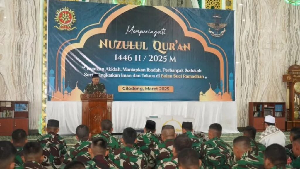 CILODONG, CARIBERITA– Divisi Infanteri 1 Kostrad menggelar peringatan Nuzulul Qur’an 1446 Hijrah dengan tema “Kuatkan Akidah, Mantapkan Ibadah, Perbanyak Sedekah, serta Tingkatkan Iman dan Taqwa di Bulan Suci Ramadhan”, bertempat di Masjid Ahmad Yani, Cilodong, Depok. Selasa (18/3/2025).