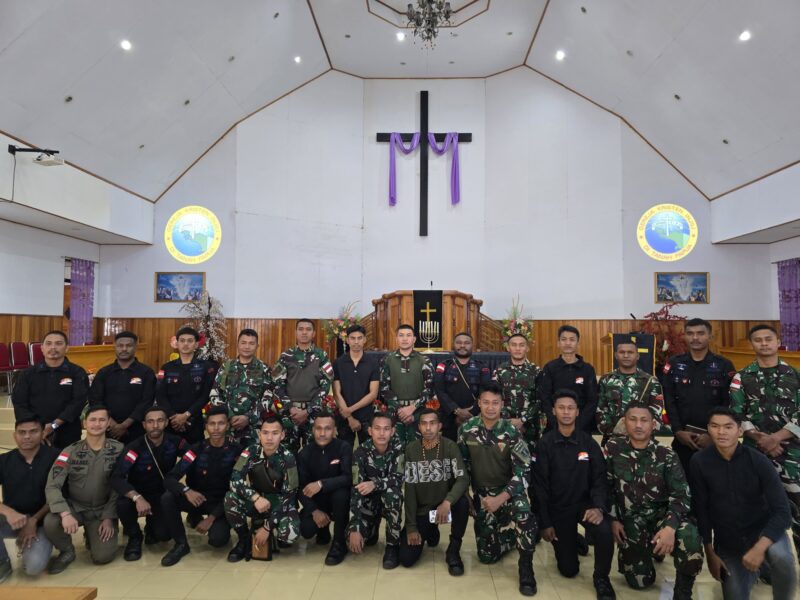 PUNCAK JAYA CARIBERITA – Personel Satgas Pamtas Kewilayahan Yonif 715/Mtl yang beragama Kristen melaksanakan ibadah Jumat Agung dengan khusuk di Gereja Kristen Injili Papua (GKI), Puncak Jaya Papua, Jumat (18/04/2025).