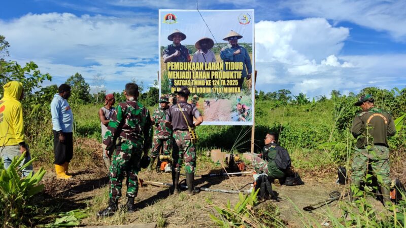 TIMIKA, CARIBERITA – Satuan Tugas TNI Manunggal Membangun Desa (TMMD) ke-124 Kodim 1710/Mimika memperluas jangkauan kegiatan dengan membuka lahan tidur menjadi lahan produktif untuk Program Ketahanan Pangan (Hanpangan), di Kampung Naena Muktipura, Distrik Iwaka, Kab. Mimika. Rabu (07/05/2025).