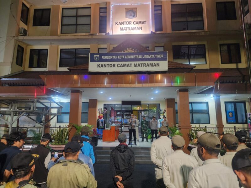 JAKARTA CARIBERITA – Antisipasi tawuran warga diwilayah Matraman , Plh Danramil 02/Matraman Kapten Inf Sukir bersama Kapolsek, Camat Matraman dan Forkopimcam empat pilar, gelar apel cipta kondisi bertempat di Kantor Kecamatan Matraman, Minggu (18/05/25) dini hari.