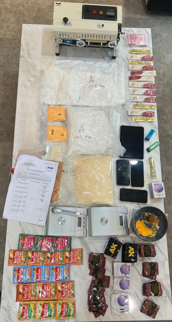 Dalam pengungkapan tersebut, polisi menemukan barang bukti yang diduga berupa beberapa bahan baku dan prekusor narkotika jenis Happy Water, yang diduga diproduksi di tempat tersebut.