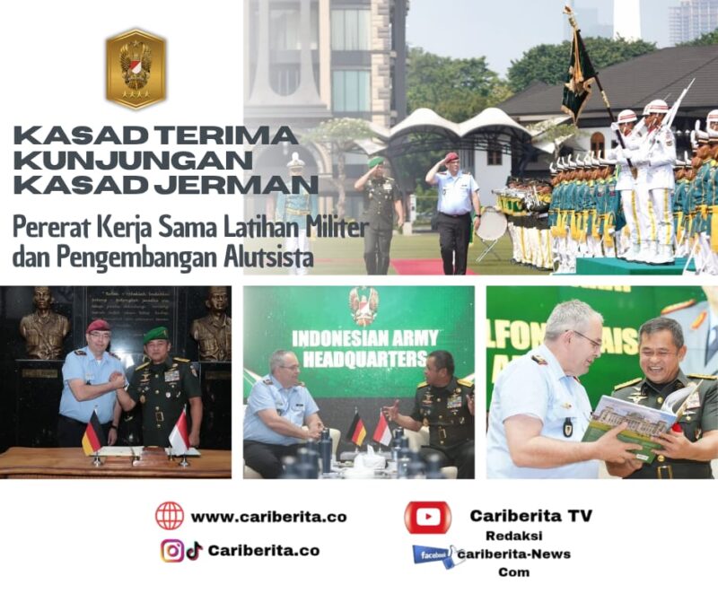 JAKARTA, CARIBERITA – Kepala Staf Angkatan Darat (Kasad) Jenderal TNI Maruli Simanjuntak, M.Sc., menerima kunjungan kehormatan Chief of the German Army (Kasad Jerman) Lieutenant General Alfons Mais di Markas Besar Angkatan Darat (Mabesad), Jakarta, Senin (21/7/2025).