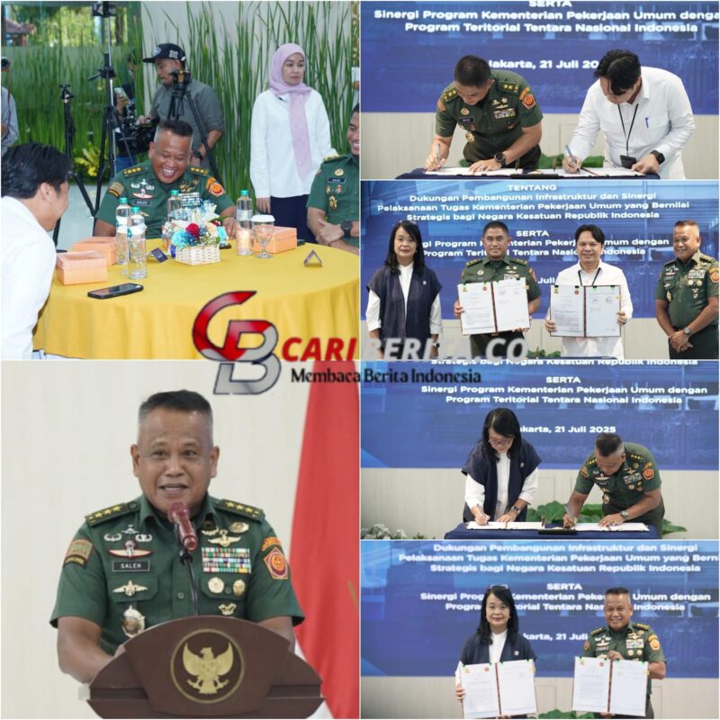 JAKARTA CARIBERITA – Tentara Nasional Indonesia (TNI) dan Kementerian Pekerjaan Umum (PU) resmi memperkuat sinergi dalam pembangunan infrastruktur nasional melalui penandatanganan Nota Kesepahaman (MoU), yang berlangsung di Pendopo Kementerian PU, Jl. Pattimura No.20, Kebayoran Baru, Jakarta Selatan, Senin (21/7/2025).