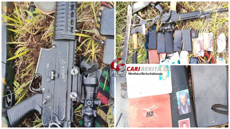 CS 024739 beserta teleskop Trijicon SN: 923632, yang diketahui merupakan milik anggota TNI yang gugur pada tahun 2019 di sektor Ugimba, 1 pucuk senapan angin, 3 buah magazen (2 magazen M16 dan 1 magazen SS), 64 butir munisi kaliber 5,56 mm, 4 unit handphone, 1 buah dompet, 2 power bank, 1 buah emas, 1 senter kepala, Alat dan perlengkapan lainnya( kapak, parang, ketapel, korek api),