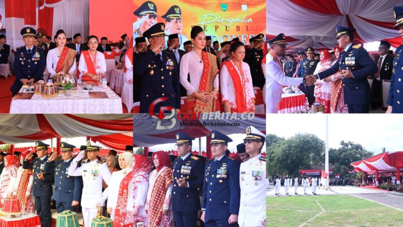MAKASSAR, CARIBERITA – Danlanud Sultan Hasanuddin Marsma TNI Arifaini Nur Dwiyanto., M.Han., didampingi Ketua PIA Ardhya Garini Cabang 7/D.ll Ny. Betty Arifaini Nur Dwiyanto mengikuti Upacara Peringatan HUT ke-80 Kemerdekaan Republik Indonesia di halaman rumah jabatan Gubernur Sulawesi Selatan, Makassar, Minggu (17/8/2025).