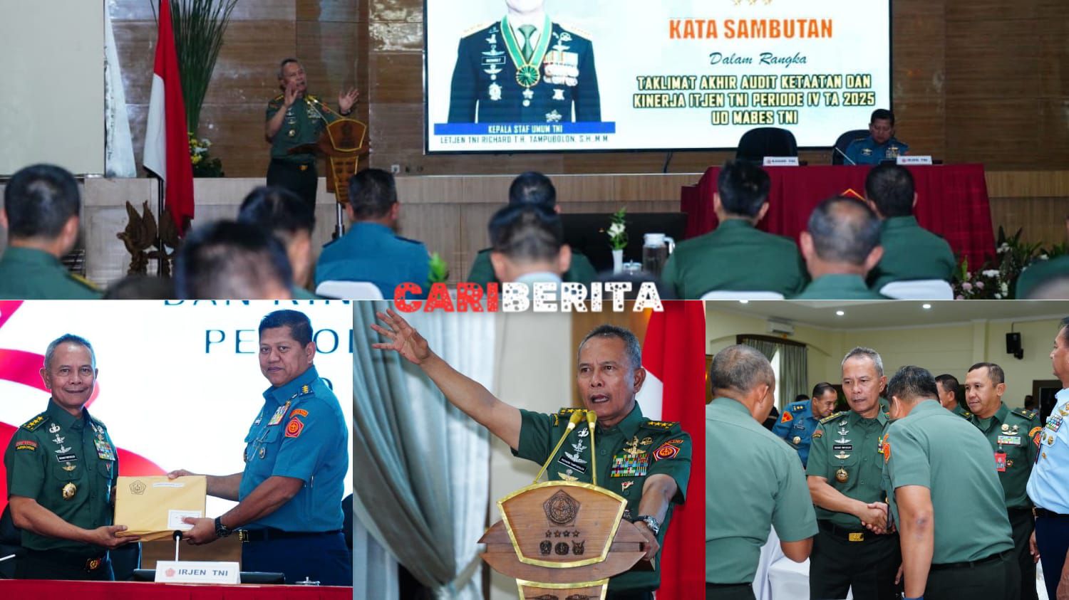 JAKARTA CARIBERITA – Kepala Staf Umum (Kasum) TNI Letjen TNI Richard Tampubolon didampingi Inspektur Jenderal (Irjen) TNI Laksdya TNI Hersan memimpin acara Taklimat Akhir Audit Ketaatan dan Kinerja Inspektorat Jenderal (Itjen) TNI Periode IV TA 2025. Kegiatan tersebut berlangsung di Aula A.H. Nasution Balog TNI, Cilincing, Jakarta Utara, Rabu (5/11/2025).