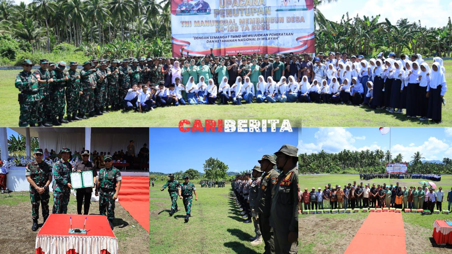 TIDORE KEPULAUAN, CARIBERITA – Program TNI Manunggal Membangun Desa (TMMD) ke-126 Kodim 1505/Tidore resmi ditutup oleh Kasdam XV/Pattimura Brigjen TNI Dr. Nefra Firdaus, S.E., M.M., dalam upacara yang berlangsung khidmat di Lapangan Bola Desa Wama, Kecamatan Oba Selatan, Kota Tidore Kepulauan, Kamis (6/11/2025).
