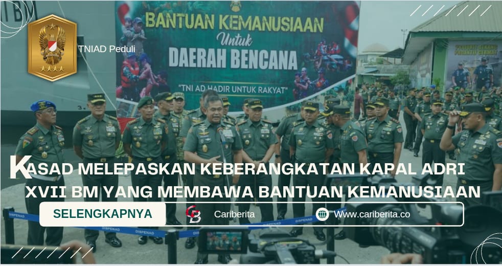 JAKARTA, CARIBERITA – Kepala Staf Angkatan Darat (Kasad) Jenderal TNI Maruli Simanjuntak, M.Sc., ? Melepaskan keberangkatan Kapal ADRI XVII BM yang membawa bantuan kemanusiaan TNI AD bagi masyarakat terdampak bencana di Aceh, Sumatera Utara, dan Sumatera Barat. Pengiriman dilakukan dari Dermaga Satangair Pusbekangad, Tanjung Priok, Jakarta, Senin (1/12/2025).