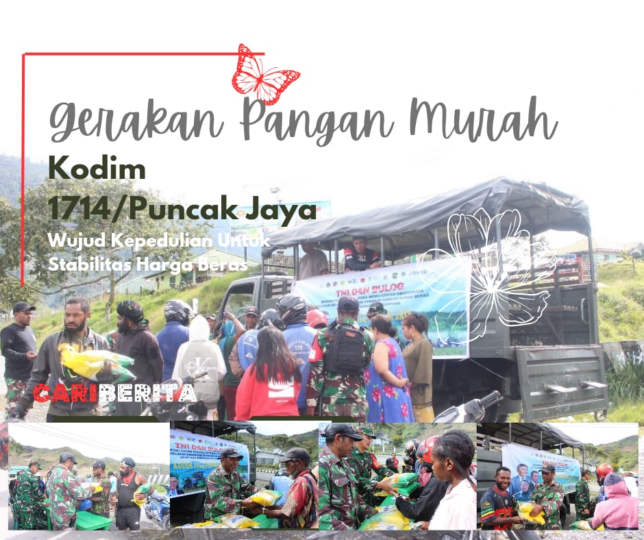 MULIA CARIBERITA – Kodim 1714/Puncak Jaya melaksanakan kegiatan Gerakan Pangan Murah sebagai bentuk kepedulian kepada masyarakat. Kegiatan ini merupakan sinergitas antara Kodim 1714/Puncak Jaya dengan Bulog dalam mendukung stabilitas pasokan dan harga pangan, khususnya beras.