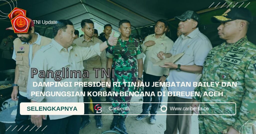 ACEH, CARIBERITA – Panglima TNI Jenderal TNI Agus Subiyanto mendampingi Presiden Republik Indonesia Prabowo Subianto meninjau langsung progres pembangunan Jembatan Bailey Teupin Mane pada ruas strategis Bireuen–Takengon serta meninjau tenda pengungsian korban bencana di Kabupaten Bireuen, Provinsi Aceh, Minggu (7/12/2025). Peninjauan ini dilakukan untuk memastikan kelancaran distribusi logistik, percepatan pemulihan infrastruktur, serta terpenuhinya kebutuhan dasar masyarakat terdampak.