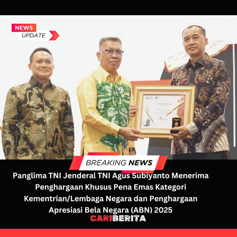 BANDUNG, CARIBERITA – Panglima TNI Jenderal TNI Agus Subiyanto menerima Penghargaan Khusus Pena Emas kategori Kementrian/Lembaga Negara yang diselenggarakan oleh Forum Pimpinan Redaksi Multimedia Indonesia, penerimaan diwakili Kapuspen TNI Mayjen TNI (Mar) Freddy Ardianzah bertempat di Le Royale Hotel Bandung, Jawa Barat, Senin (22/12/2025).