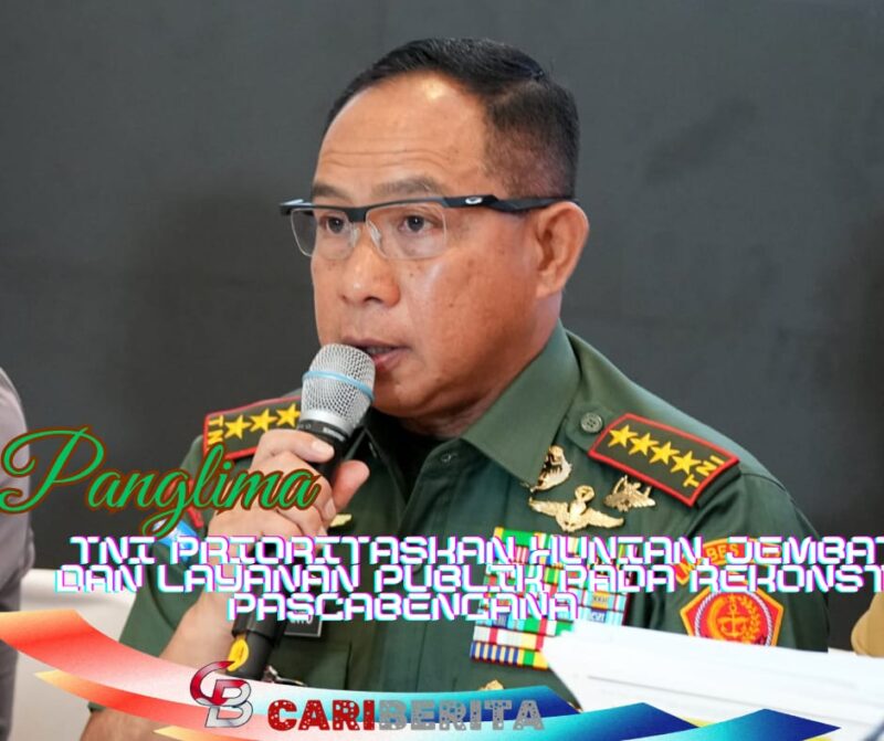JAKARTA CARIBERITA – Panglima TNI Jenderal TNI Agus Subiyanto menegaskan komitmen TNI dalam mempercepat rekonstruksi dan rehabilitasi pascabencana di wilayah Aceh, Sumatera Barat, dan Sumatera Utara, dengan fokus utama pada pembangunan hunian, pemulihan akses transportasi, serta pengaktifan kembali fasilitas umum. Hal tersebut disampaikan Panglima TNI saat memberikan keterangan pers di Posko Terpadu Penanggulangan Bencana Sumatera, Lanud Halim Perdanakusuma, Jakarta Timur, Senin (29/12/2025).
