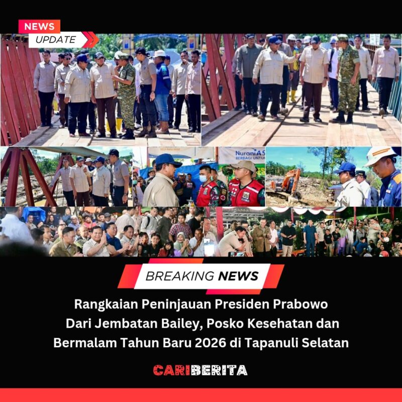 TAPANULI SELATAN, CARIBERITA – Wakil Panglima TNI Jenderal TNI Tandyo Budi R mendampingi Presiden Republik Indonesia Prabowo Subianto bersama Menhan RI Sjafrie Sjamsoeddin dan Kepala Staf TNI Angkatan Darat Jenderal TNI Maruli Simanjuntak meninjau pembangunan Jembatan Bailey Sungai Garoga dan Posko Kesehatan Kodam I/Bukit Barisan di Kecamatan Batang Toru, Kabupaten Tapanuli Selatan, Sumatera Utara, Rabu (31/12/2025). Kunjungan ini menegaskan komitmen pemerintah dalam memastikan pemulihan pascabencana berjalan menyeluruh, menyentuh aspek infrastruktur vital dan layanan dasar masyarakat.Di lokasi Sungai Garoga, Presiden Prabowo meninjau langsung progres pembangunan Jembatan Bailey sepanjang 44 meter yang berfungsi sebagai penghubung strategis antarwilayah. Jembatan ini dibangun oleh Batalyon Zeni Tempur 1/DD (Yonzipur) Kodam I/BB bekerja sama dengan Direktorat Jenderal Bina Marga Kementerian Pekerjaan Umum sebagai solusi cepat pengganti jembatan lama yang rusak akibat bencana, serta mampu menahan beban hingga 25 ton untuk mendukung mobilitas warga dan distribusi logistik.