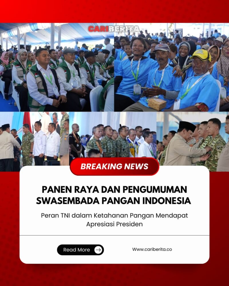 KARAWANG, CARIBERITA – Wakil Panglima TNI Jenderal TNI Tandyo Budi R mewakili Panglima TNI Jenderal TNI Agus Subiyanto mendampingi Presiden Republik Indonesia Prabowo Subianto bersama Menteri Pertahanan RI Sjafrie Sjamsoeddin menghadiri acara Panen Raya sekaligus Pengumuman Swasembada Pangan Indonesia yang diikuti sekitar 5.000 petani dan penyuluh pertanian secara luring serta lebih dari 2 juta petani secara daring. Kegiatan ini terpusat di Halaman Kantor Kecamatan Cilebar, Kabupaten Karawang, Jawa Barat, Rabu (7/1/2026).