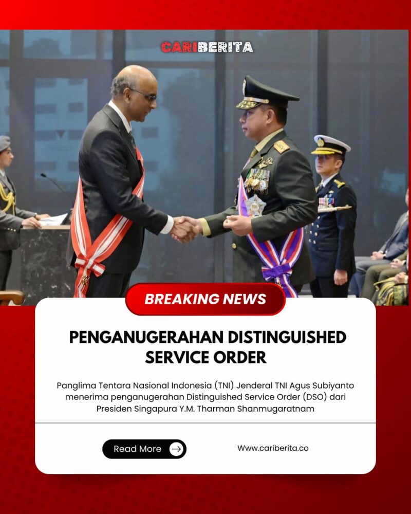 SINGAPURA, CARIBERITA – Panglima Tentara Nasional Indonesia (TNI) Jenderal TNI Agus Subiyanto menerima penganugerahan Distinguished Service Order (DSO) dari Presiden Singapura Y.M. Tharman Shanmugaratnam, dalam sebuah upacara kehormatan yang berlangsung di kantor Kemenhan Singapura, Rabu (7/01/2026).