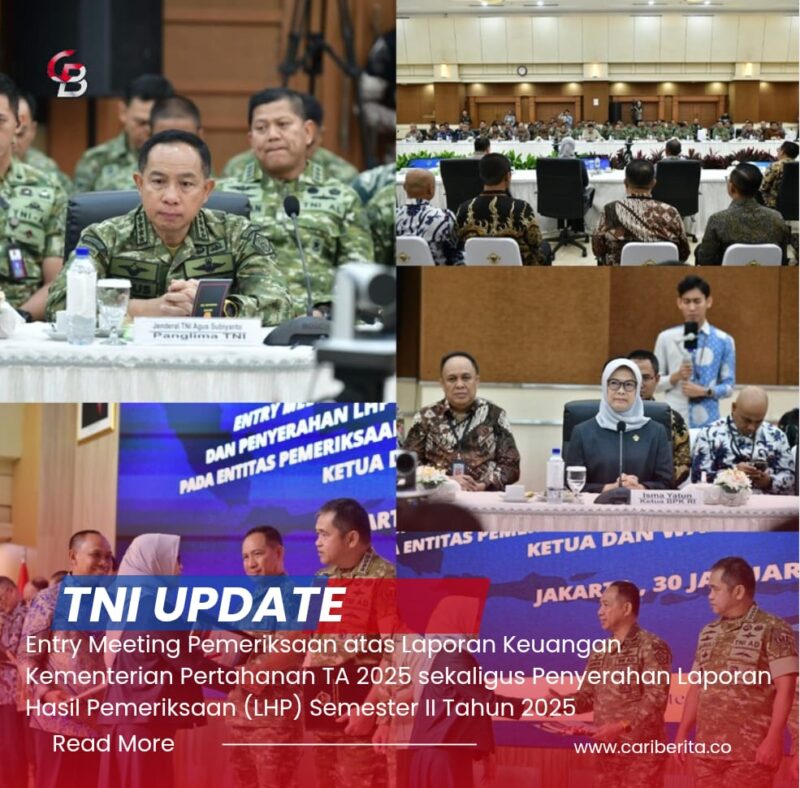 JAKARTA CARIBERITA – Panglima TNI Jenderal TNI Agus Subiyanto bersama Kepala Staf TNI Angkatan Darat Jenderal TNI Maruli Simanjuntak, Kepala Staf TNI Angkatan Laut Laksamana TNI Muhammad Ali, serta Kepala Staf TNI Angkatan Udara Marsekal TNI Mohamad Tonny Harjono mendampingi Menteri Pertahanan Republik Indonesia Sjafrie Sjamsoeddin menghadiri Entry Meeting Pemeriksaan atas Laporan Keuangan Kementerian Pertahanan Tahun Anggaran 2025 sekaligus Penyerahan Laporan Hasil Pemeriksaan (LHP) Semester II Tahun 2025 oleh Badan Pemeriksa Keuangan Republik Indonesia (BPK RI), di Kantor BPK RI, Jakarta Pusat, Jumat (30/1/2026).