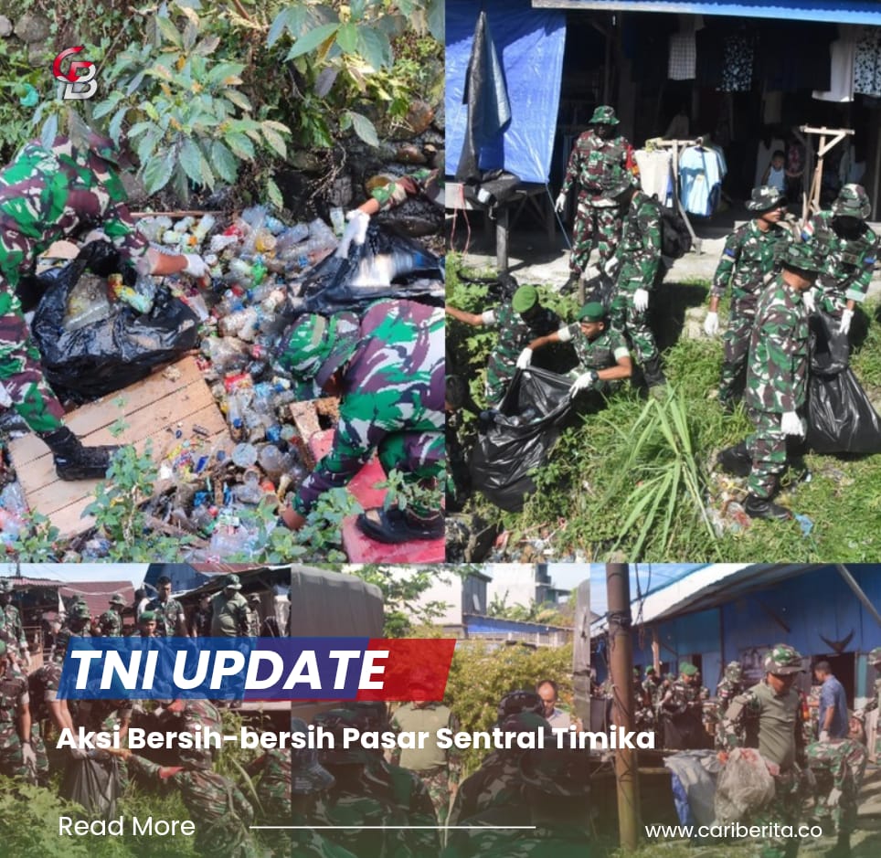 TIMIKA, CARIBERITA – Kodim 1710/Mimika menggelar aksi bersih-bersih sampah di Pasar Sentral Timika, Rabu (4/2/2026). Kegiatan ini dipimpin oleh Kasdim 1710/Mimika, Mayor Inf Abdul Munir, dan dihadiri Kepala Dinas Perindustrian dan Perdagangan Kabupaten Mimika, Petrus Pali Ambang, ST., MT.
