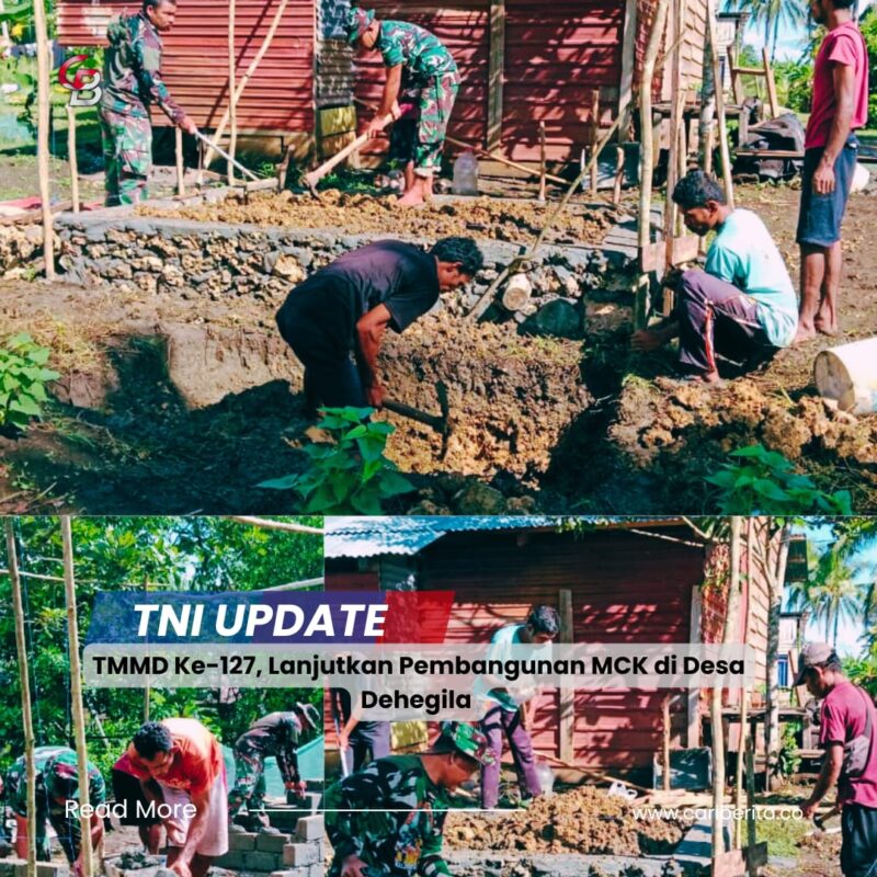 MOROTAI, MALUKU UTARA, CARIBERITA – Personel Satgas TMMD Ke-127 Kodim 1514/Morotai bersama warga melaksanakan pekerjaan penyusunan batu tela pada sasaran pembangunan MCK di Desa Dehegila, Kecamatan Morotai Selatan, Rabu (25/02/2026).