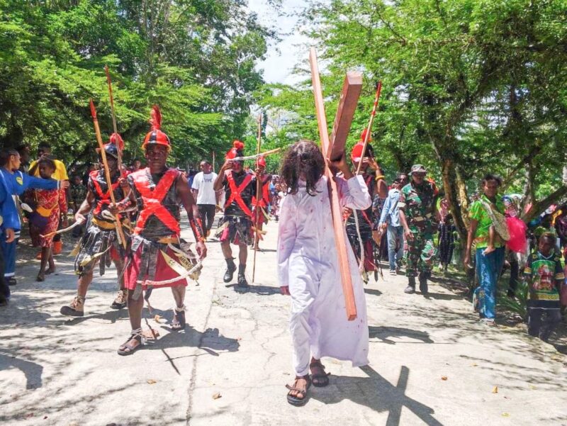 TIMIKA, CARIBERITA – Babinsa Koramil 1710-07/Mapurujaya, Sertu Yulius Nampe, melaksanakan pengamanan kegiatan ibadah dan prosesi jalan salib yang berlangsung di Distrik Mimika Timur, Jumat (3/4/2026).