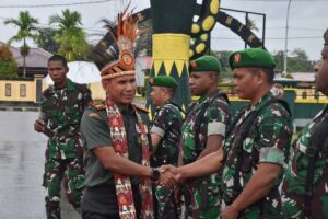 TIMIKA, CARIBERITA – Dalam suasana penuh semangat meskipun diguyur gerimis, Kodim 1710/Mimika menggelar tradisi penyambutan Dandim baru Letkol Inf Jozanda beserta Ketua Persit KCK Cabang XXXV, Ny. Jozanda, di Makodim 1710/Mimika, Senin (06/04/2026).