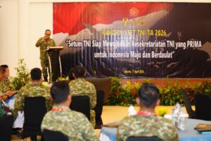 JAKARTA, CARIBERITA – Kepala Sekretariat Umum (Kasetum) TNI Brigjen TNI Adek Chandra Kurniawan, S.I.P., M.Han., secara resmi membuka Rapat Koordinasi Teknis Kesekretariatan (Rakornisset) TNI TA 2026 yang mengusung tema “Setum TNI Siap Mewujudkan Kesekretariatan TNI yang Prima untuk Indonesia Maju dan Berdaulat”. Kegiatan ini digelar di Kinasih Resort, Depok, Jawa Barat, Selasa (7/4/2026).