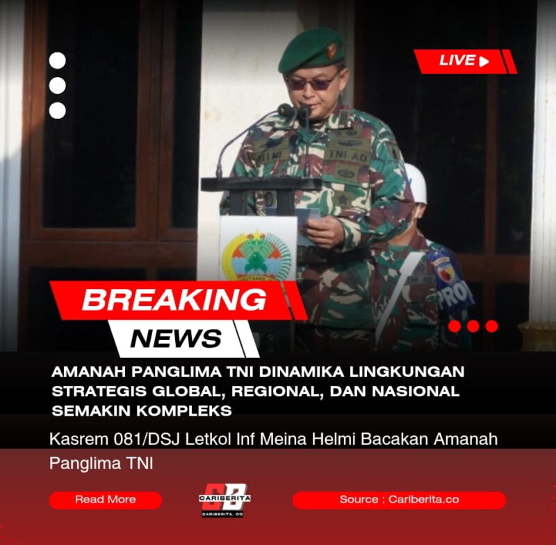 MADIUN, CARIBERITA – Panglima TNI Jenderal Agus Subiyanto menyampaikan bahwa dinamika lingkungan strategis global, regional, dan nasional yang semakin kompleks saat ini memberikan dampak signifikan terhadap kondisi bangsa Indonesia.