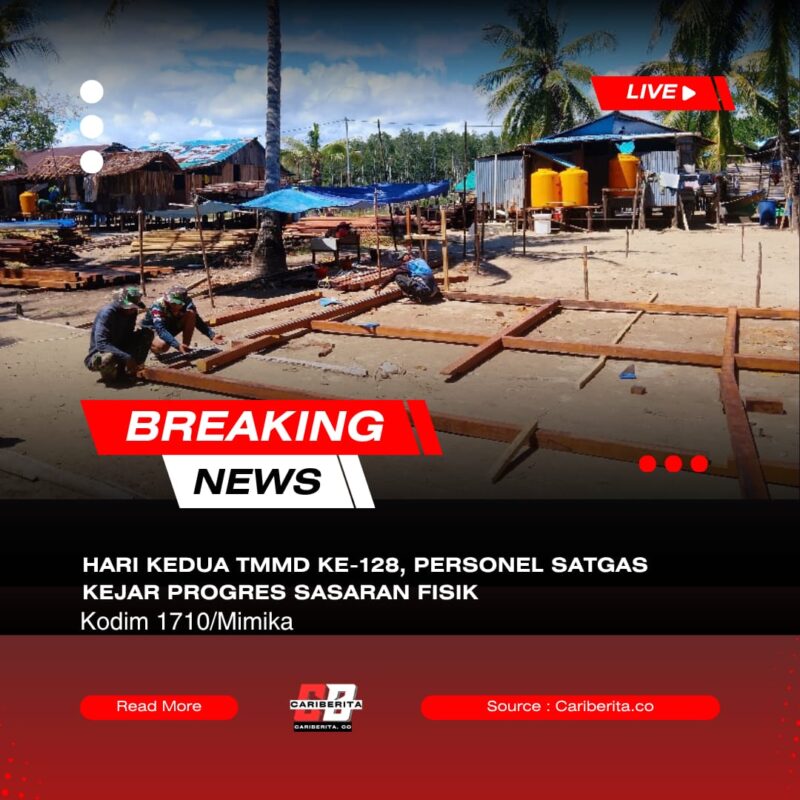 TIMIKA, CARIBERITA – TNI Manunggal Membangun Desa (TMMD) Reguler ke-128 hari kedua, Kodim 1710/Mimika genjot progres sasaran fisik pembangunan 5 unit rumah type 36 dan 5 unit kamar mandi dan MCK umum di Kp. Keakwa, Distrik Mimika Tengah, Kab. Mimika, Kamis (23/04/2026).